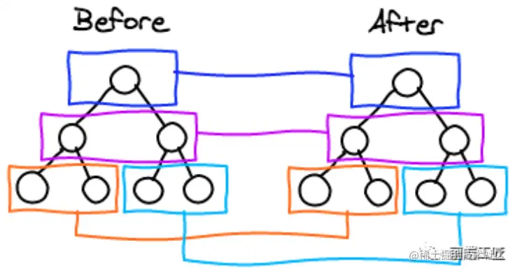节点判断是否是同一个元素,如果是同一个元素,则比对属性比对孩子,如果不是则直接删除老的换成新的