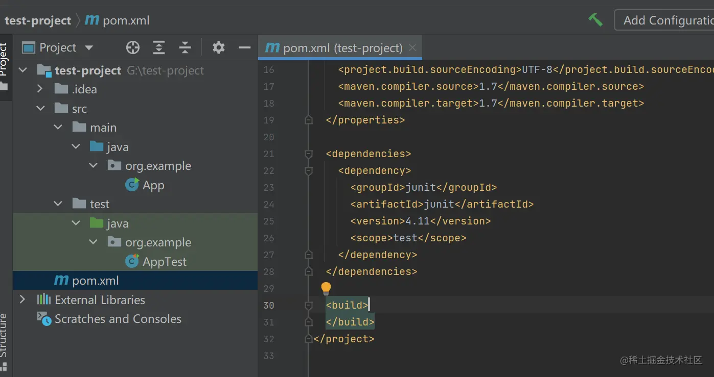 为了方便演示,我们pom.xml里,删除了元素里的内容(主要是被插件版本的管理,我们为了演示,直接删了,用默认版本就行),删除后的pom如下: