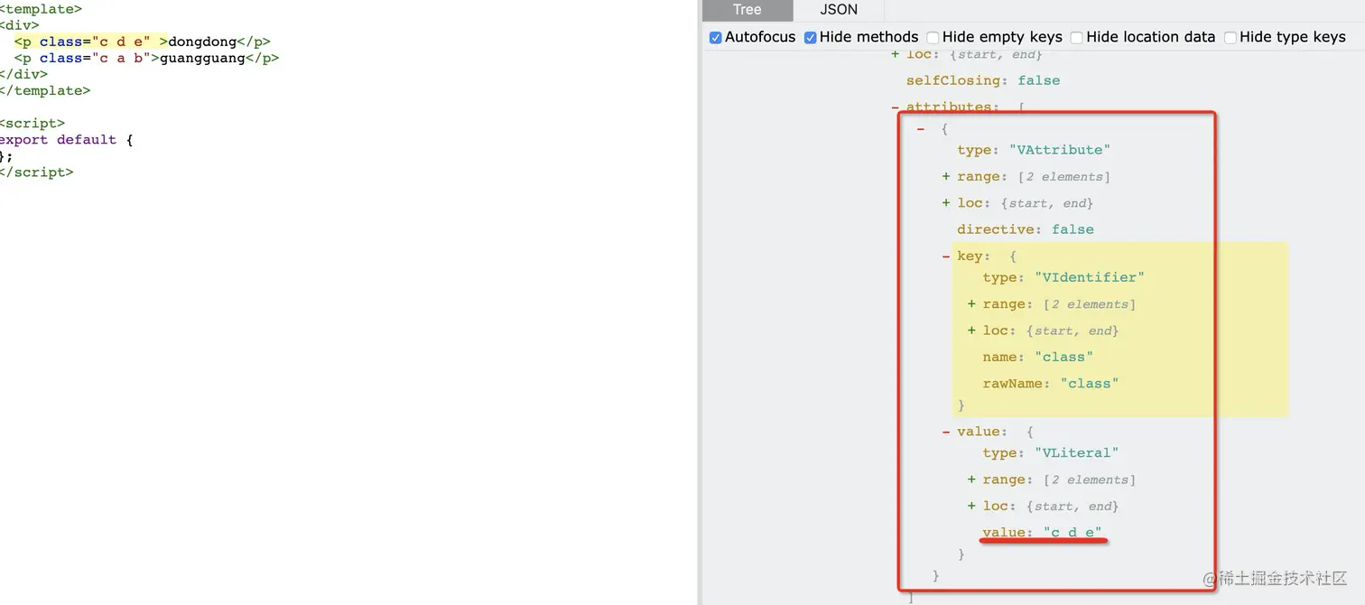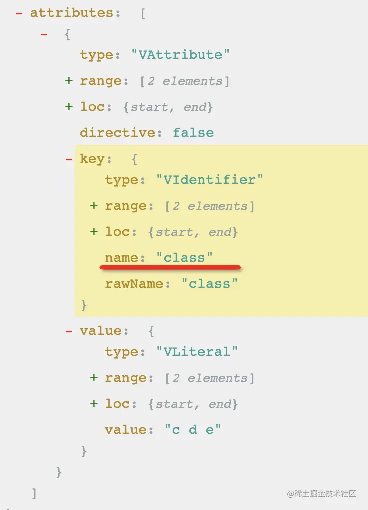 eslint 支持esqury 的写法,也就是可以通过选择器的方式来指定要处理的节点,这里我们指定 key.name 为 class 的 VAttribute 节点