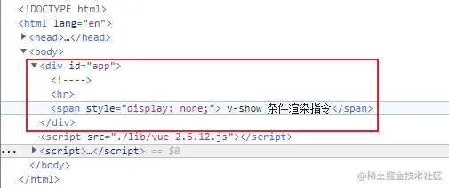 我们可以通过 F12 控制台查看页面元素,发现页面元素缺失了 v-if 修饰的 span 元素,因此我们得出结论: