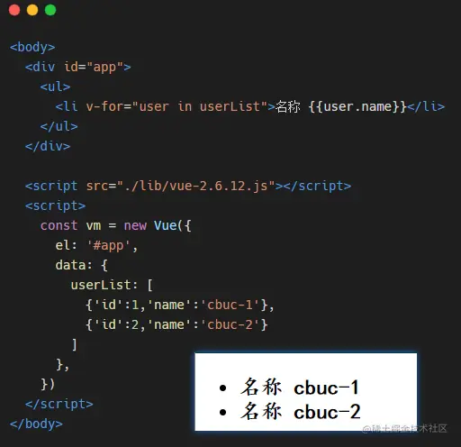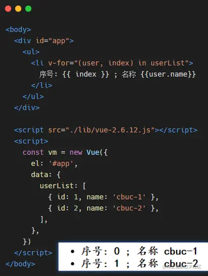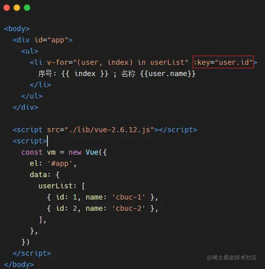 这个指令通常搭配的还有一个关键指令 :key,vue 中使用 key 来维护列表的状态,当列表的数据发生变化时,默认情况下,vue 会尽可能复用已存在的 DOM 元素,从而提升渲染的性能,但这种默认的性能优化策略,会导致有状态的列表无法备正确更新。
