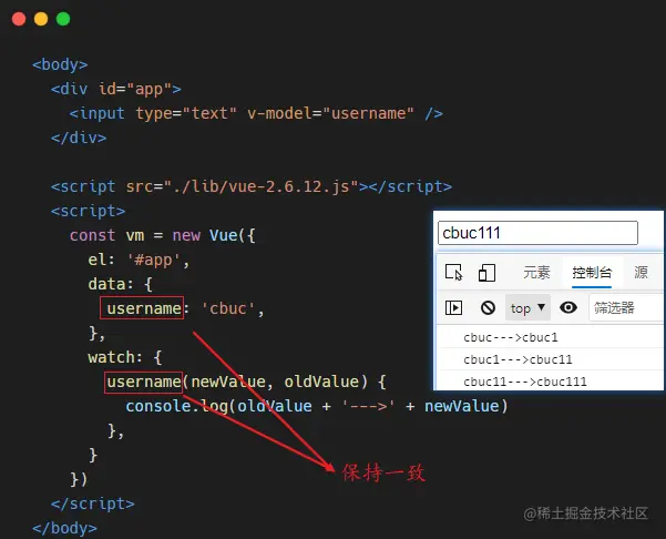 我们可以在 input 输入框中更改 username 的值,相应的,页面上{{ username }} 值也会发生变化~!