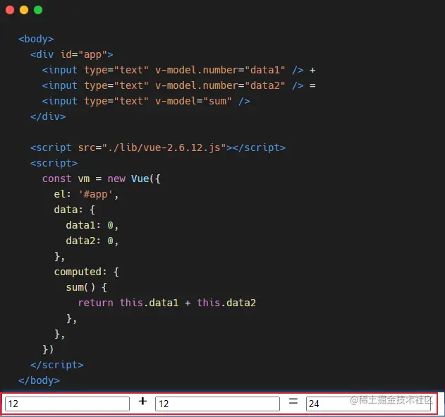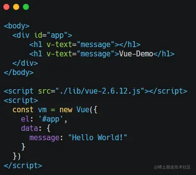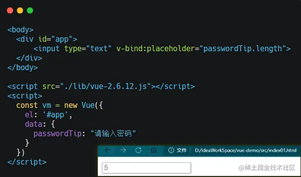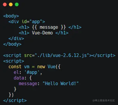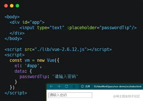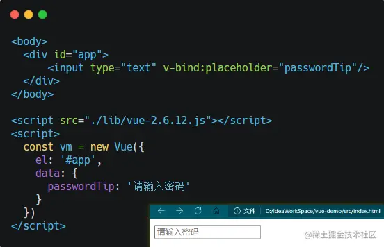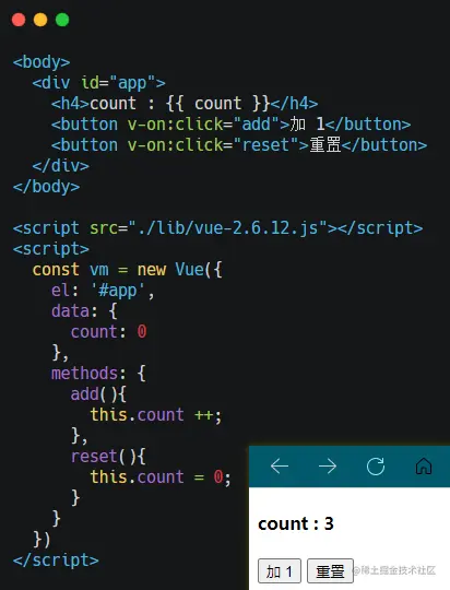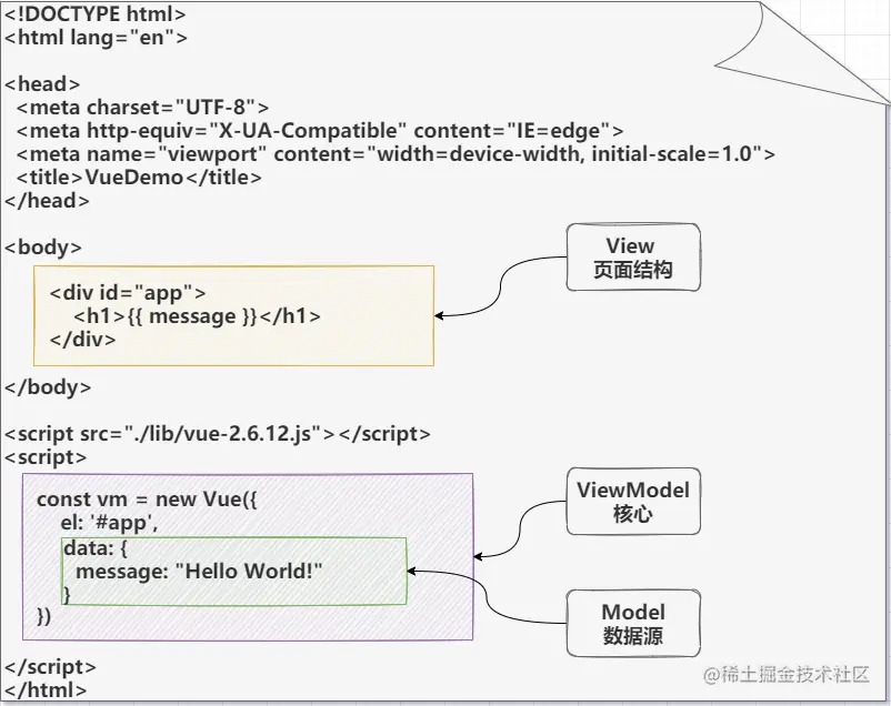这个是一个非常简单的 Vue 例子,但里面已经包含了 View - ViewModel - Model 三部分的结构
