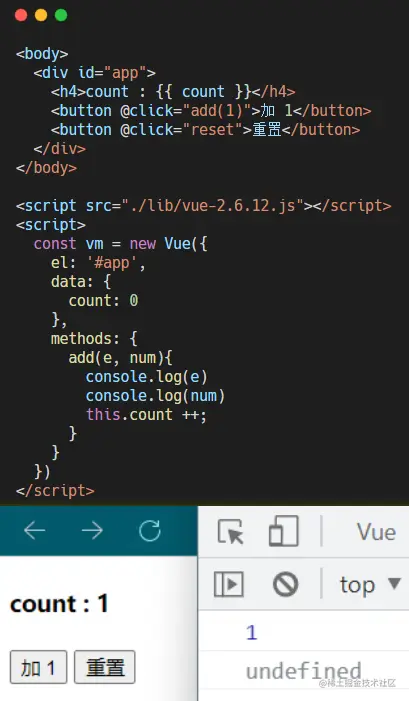 可以发现这种方法不得行,我们的事件参数对象被覆盖了!那这就可以说到 vue 为我们提供的一个 特殊变量 $event,该变量用来表示原生的事件参数对象 event。$event 可以解决事件参数对象 event 被覆盖的问题。