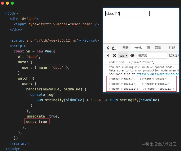 通过控制台我们发现,处理首次监听之外,后面做出的更改都没有触发侦听器!那这个时候就需要用上我们的 deep 属性: