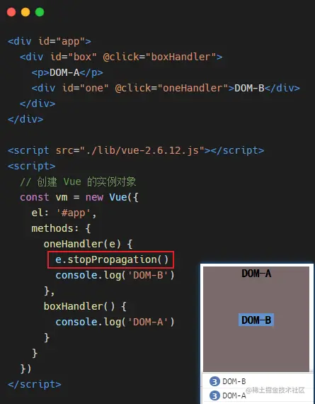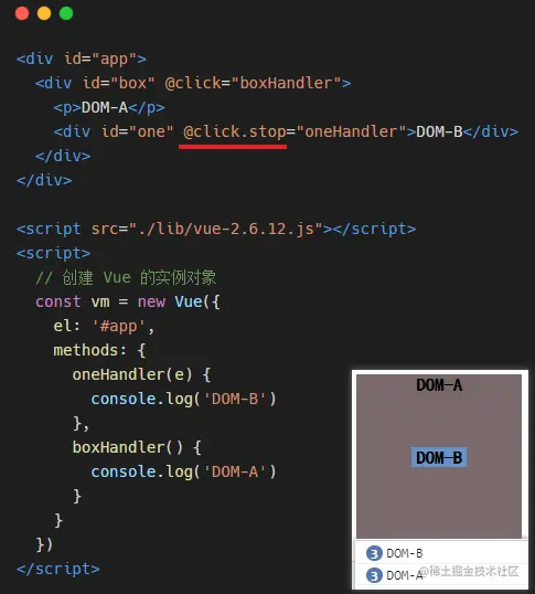 通过函数 stopPropagation() 便可以解决事件冒泡问题,但是 Vue 中提供了更加优雅的解决方案~