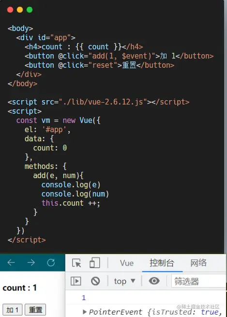 在原生的 DOM 事件绑定中,可以在事件处理函数的形参处,接收事件参数对象 event,同样,在 v-on 指令所绑定的事件处理函数中,我们一样可以通过上述方式获取到 事件参数对象 event