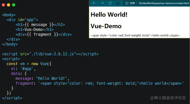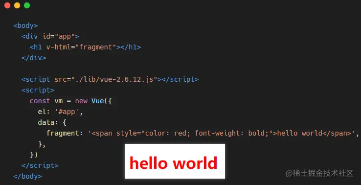 该指令一看就知道是和 html 沾边的,由于 v-text 和 插值表达式 只能帮助我们渲染纯文本内容。如果要把包含 HTML 标签的字符串渲染为页面 HTML 元素,就需要用到这个v-html指令