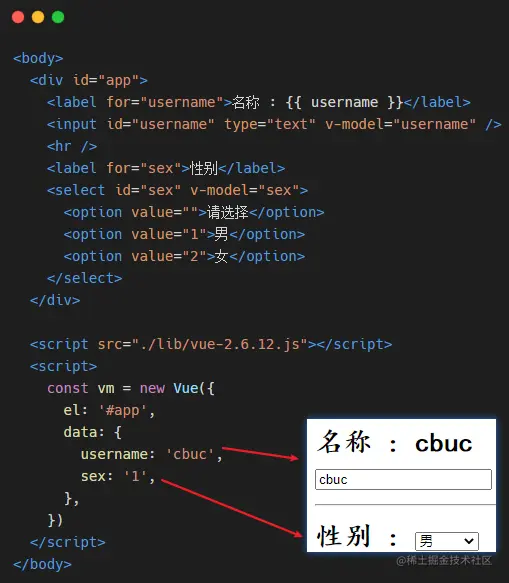 双向绑定指令 的好处便是 不用操作DOM 元素的情况下,可以快速获取表单的数据