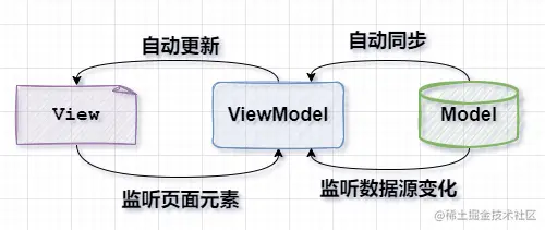 - 当页面元素的值发生变化的时候,也会被 ViewModel 监听到,便会把变化后的最新值同步到 Model 数据源中