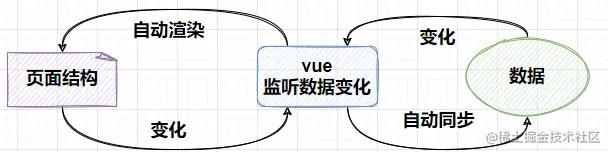 使用 vue 的页面中,vue 会自动监听数据的变化,从而自行渲染页面的结构。在vue中,无需手动操作 DOM 节点,它会通过一些特殊的 HTML 语法,将 DOM 和数据绑定起来,一旦创建了绑定,DOM 将和数据保持同步,每当变更了数据,DOM 也会相应的更新