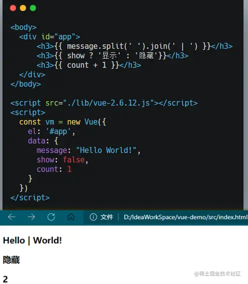 这个是 vue 提供的语法,专门用来解决 v-text 覆盖默认文本内容值的问题。这种 {{ }} 语法的专业名称叫做 插值表达式,下面来看使用方法: