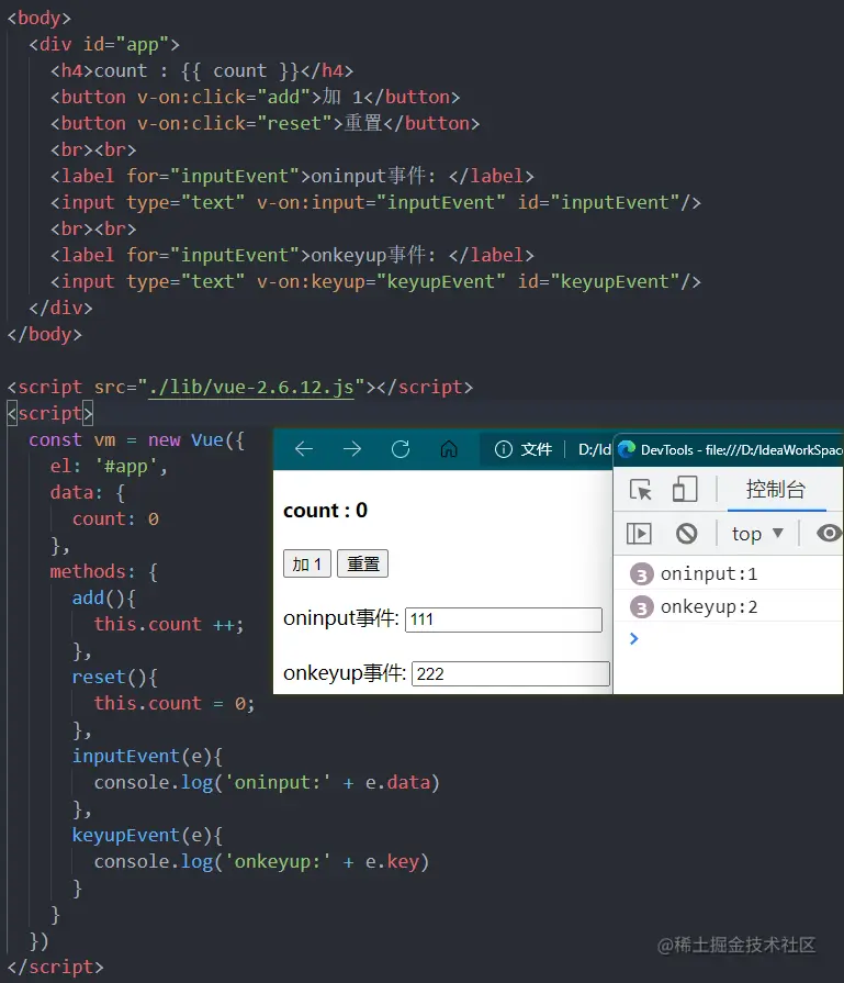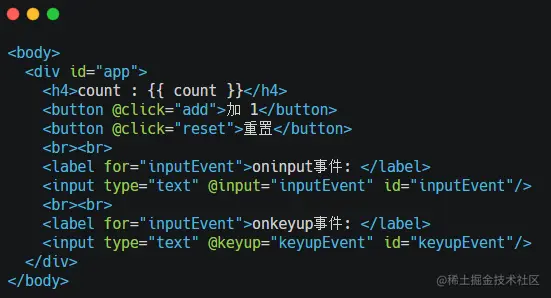 我们在 data 中定义了数据源,在 methods 中定义了方法,通过 v-on 指令来绑定事件。整体结构清晰明了,当然处理 onclick 事件除外,我们还可以使用 oninput、onkeyup 等原生事件