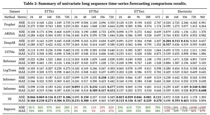 对于单变量长时间序列预测任务,HI在ETTh1和ETTm1数据集上显著优于SOTA模型。Informer及其变体主导了ETTh2数据集的最优结果。而对于Electricity数据集,HI,Informer和DeepAR都有较好的表现。整体来看,HI在MSE和MAE上分别实现了高达80%和58%的相对提高。