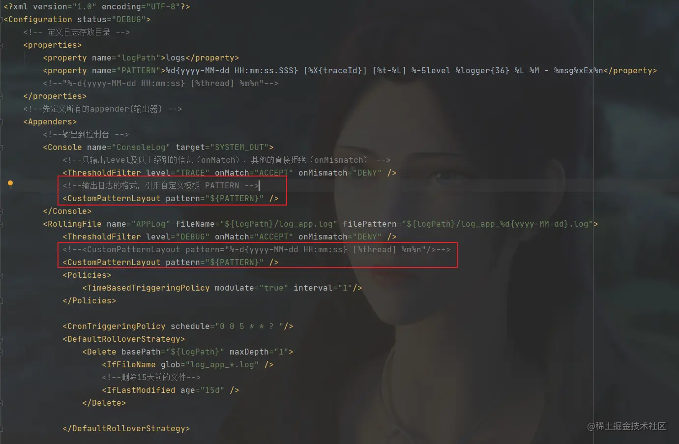 其实这里修改很简单,原配置文件是直接使用PatternLayout进行日志格式化的,那么只需要将默认的<PatternLayout/>这个节点替换成<CustomPatternLayout/>,如下图: