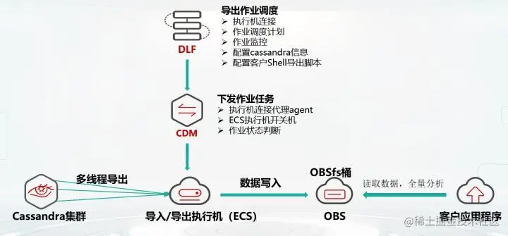 客户的另一个业务需要周期性对全量数据进行分析和处理,但不想影响在线业务,希望在闲时处理。GaussDB (for Cassandra)提供了全量数据导出和分析解决方案,可在业务低峰期触发任务进行数据导出和冷数据分析,数据导出速率是开源的10+倍,同时做到对业务读写基本无影响。如下为互联网客户每周定期导出数据分析用户画像的解决方案,该方案有以下几个阶段: