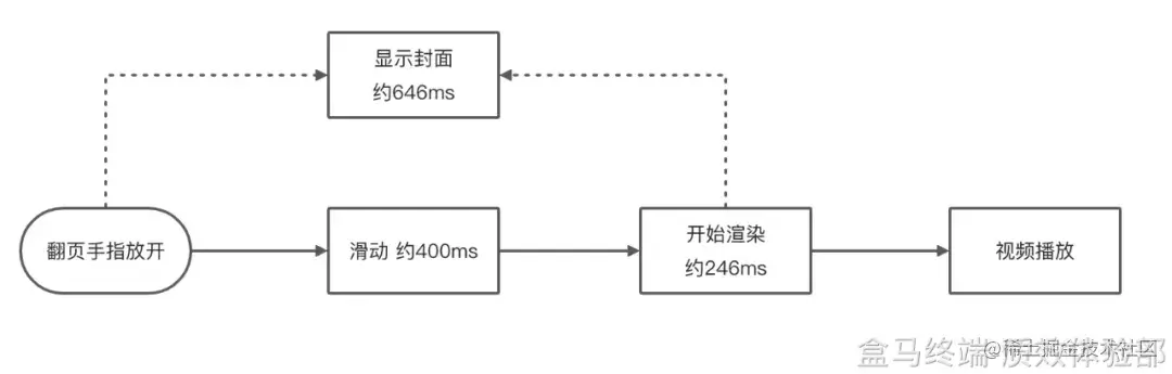 盒马最初为了保证进入画面时不是空白页面而增加了封面图显示,在播放时隐藏。从体感指标可以看出,即便是优化前,体感播放时间很短,只有 200ms 左右(不包含滑动过程)。由于滑动过程中,到视频正式播放有约 600ms 左右时间显示封面,随后又迅速显示播放画面,此时用户仍有强烈的屏幕闪烁和顿挫感,体验极差。