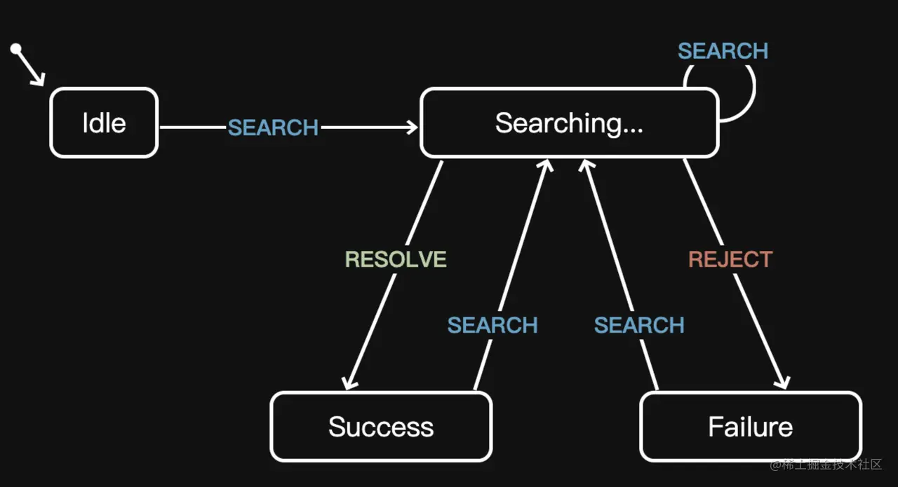 在这两种状态下,我们可以再次发起新的 search 事件,通过箭头指向,我们可以清晰地看出它将回到 searching 状态。