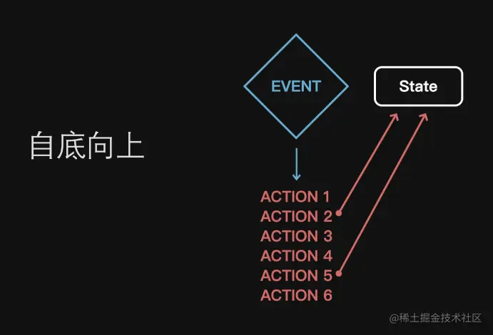 每个 event 可能对应许多不同的 action (行为),并且其中一些 action 还会修改 state (状态)