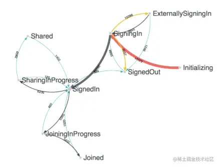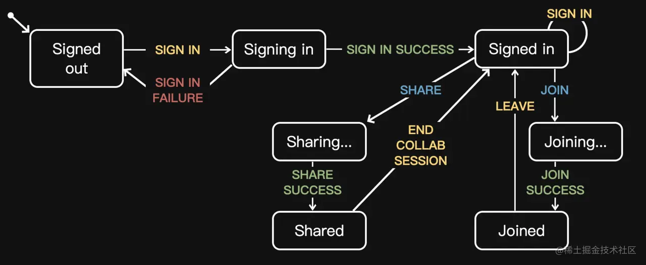 拿登录举例。 登录后进入 Signed In 状态,这时可以做两件事,share (分享) 一个 session (会话) 或者 join (加入) 一个 session。 登录失败,需要返回 Signed Out 状态。