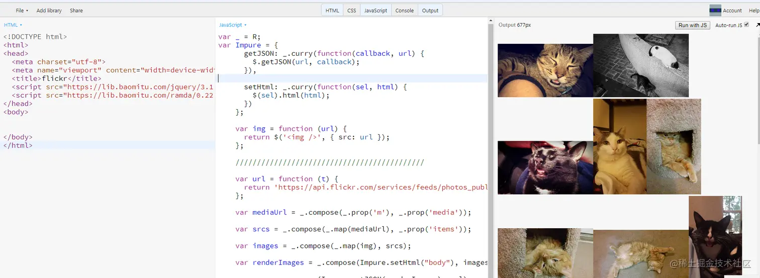 4.把图片放到屏幕上上面提到了两个不纯的动作,即从 flickr 的 api 获取数据和在屏幕上放置图片这两件事。我们先来定义这两个动作,这样就能隔离它们了。这里我们只是简单包装了一下 jQuery 的 getJSON 函数,把它变为一个 curry 函数,还有就是把参数位置也调换了下,我们把它们放在 Impure 命名空间下以用来隔离,这样我们就知道它们都是危险函数。运用函数柯里化和函数组合的技巧,我们就可以创建一个函数式的实际应用了:预览地址:demo看看,多么美妙的声明式规范啊,只说做什么,不说怎么做。现在我们可以把每一行代码都视作一个等式,变量名所代表的属性就是等式的含义。