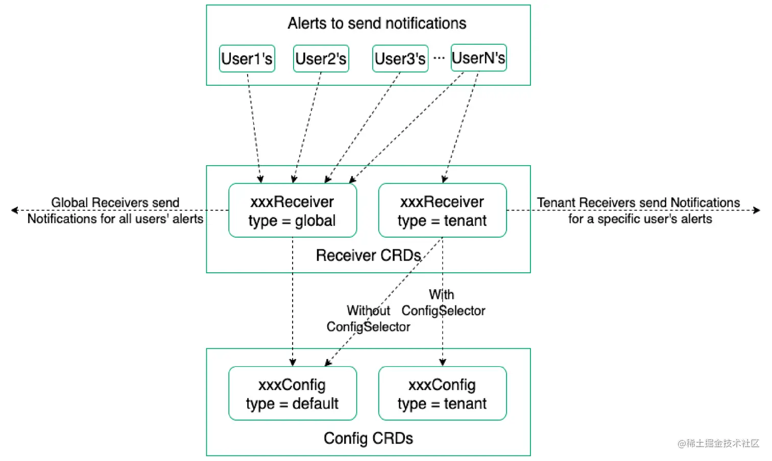 全局 Receiver 只能使用全局的 Config,租户 Receiver 通过标签选择器选择租户定义的租户 Config,如果未定义标签选择器,或未找到 Config,则使用全局 Config。