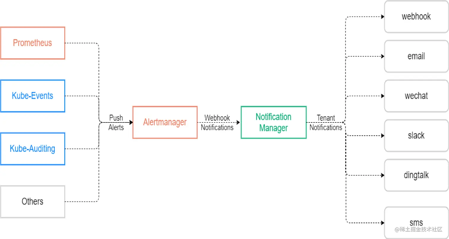Notification Manager 是 KubeSphere 可观测团队开源的一款 Kubernetes 平台上的多租户通知管理系统,其从 Alertmanager 接收告警消息,并根据告警消息的租户标签(如 namespace)将告警消息发送到对应的通知渠道,DingTalk,Email,Slack,WeCom,Webhook,短信平台(阿里、腾讯,华为)等。