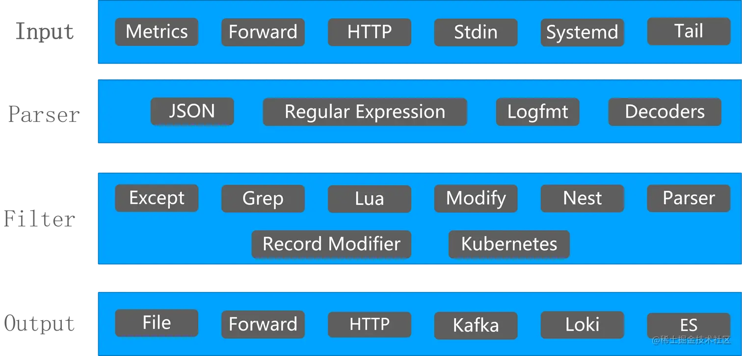 日志通过数据管道从数据源发送到目的地,一个数据管道通常由 Input、Parser、Filter、Buffer、Routing 和 Output组成。