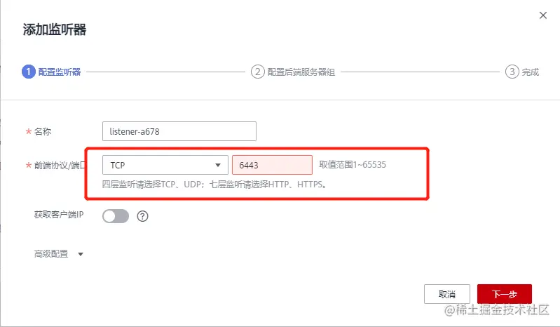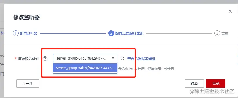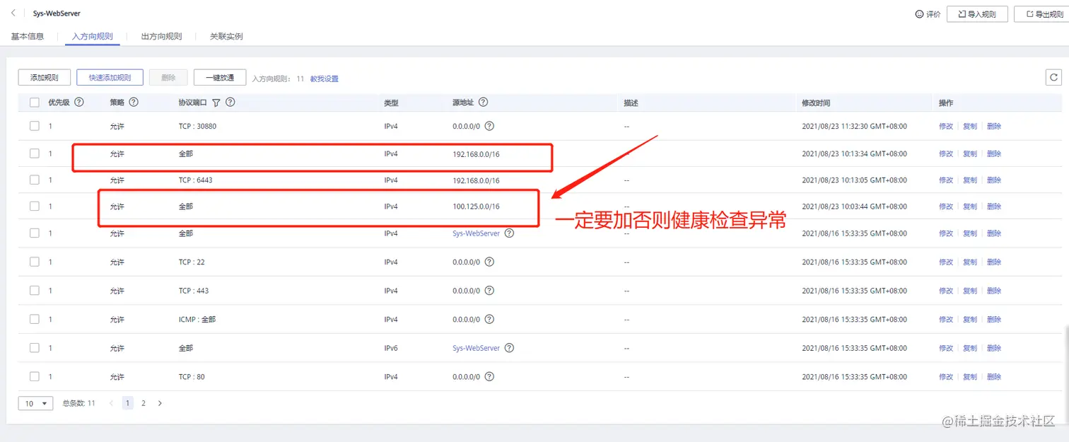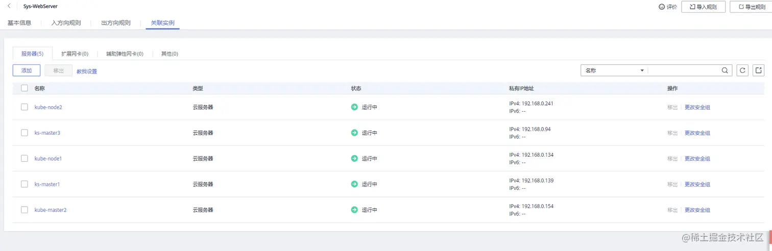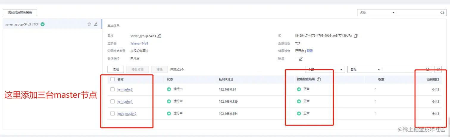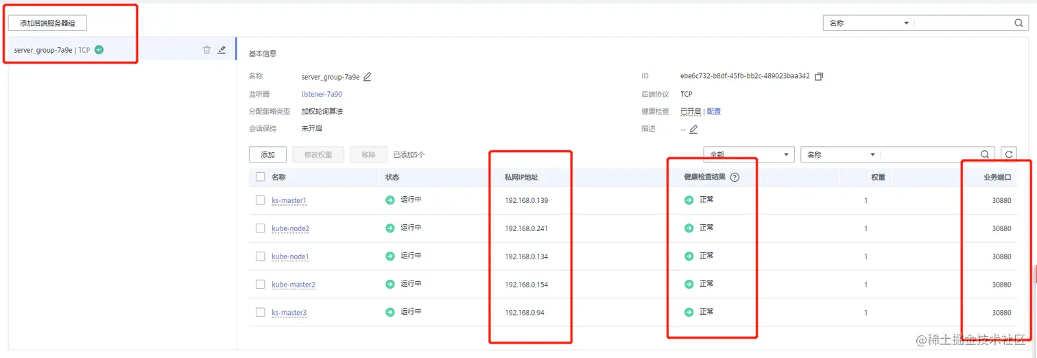 若集群需要配置公网访问,则需要为外网负载均衡器配置一个公网 IP 为 所有节点 添加后端监听器,监听端口为 80(测试使用 30880 端口,此处 80 端口也需要在安全组中开放)。
