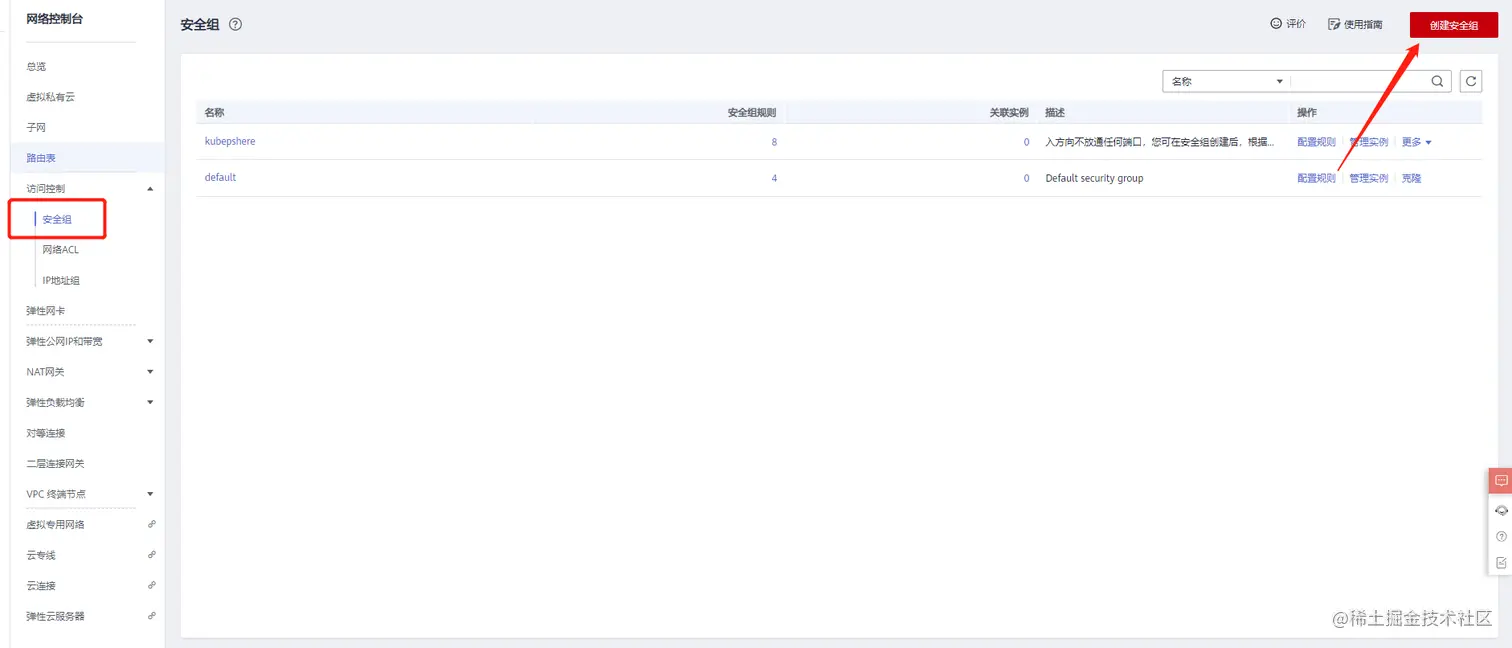 创建一个安全组,设置入方向的规则、关联实例参考如下: