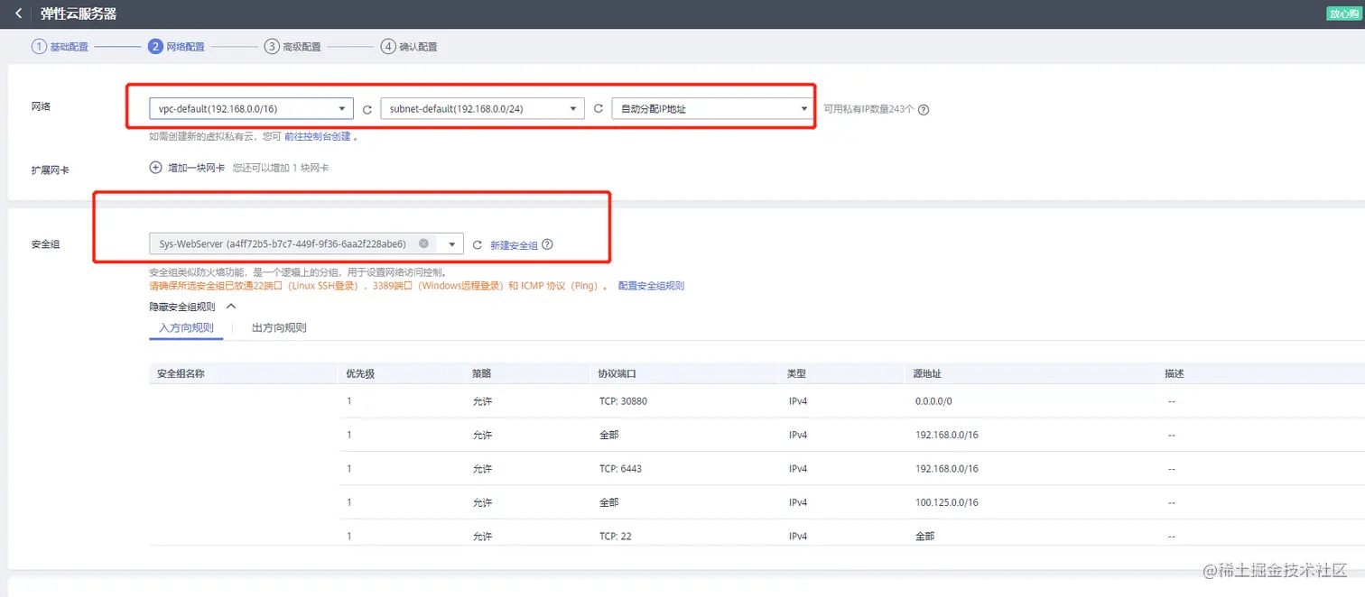 在网络配置中,网络选择第一步创建的 VPC 和子网。在安全组中,选择上一步创建的安全组。
