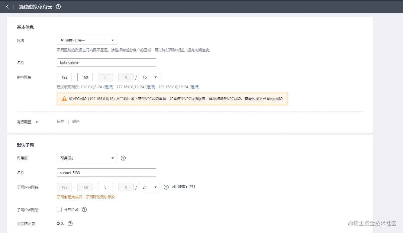 进入到华为云控制, 在左侧列表选择「虚拟私有云」, 选择「创建虚拟私有云」 创建 VPC,配置如下图: