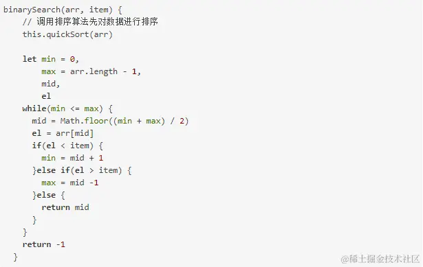 由上图大家可以很容易的理解二分搜索的实现过程,接下来我们看下代码实现:
