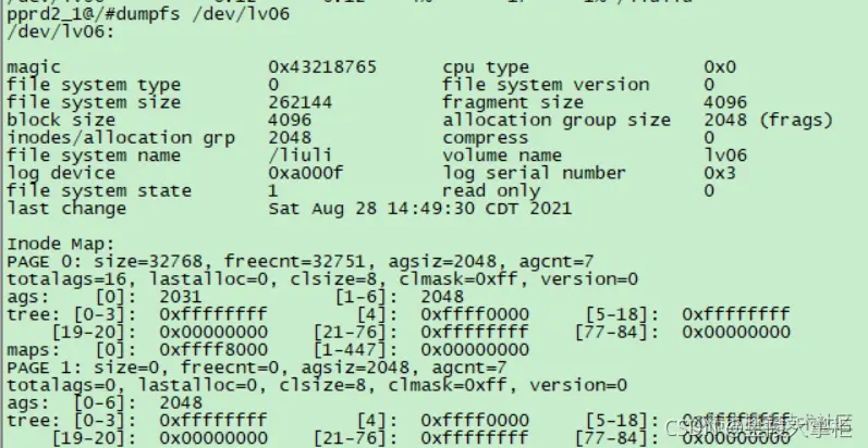 从上图中的显示结果中可以看出/liuli文件系统的中碎片大小是4096 字节,分配组的大小是以碎片为单位来表示的,即 2048 个碎片,因此/liuli文件系统的分配组大小是 4096字节×2048=8MB。