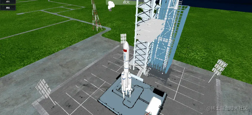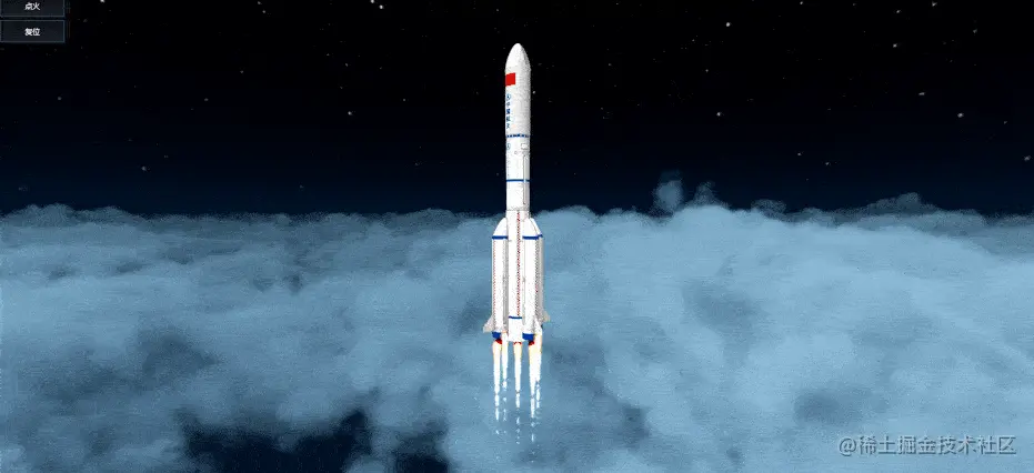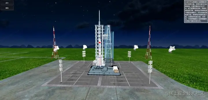 利用ThingJS制作的的长征五号升空过程可视化呈现,对长五箭体、发射厂区以及火箭垂直总装运转过程、点火发射以及飞行过程数据进行精细呈现,对助推分离、整流罩分离,到一二级分离、末修调姿,再到上面级与基础级分离等全过程进行全面呈现。