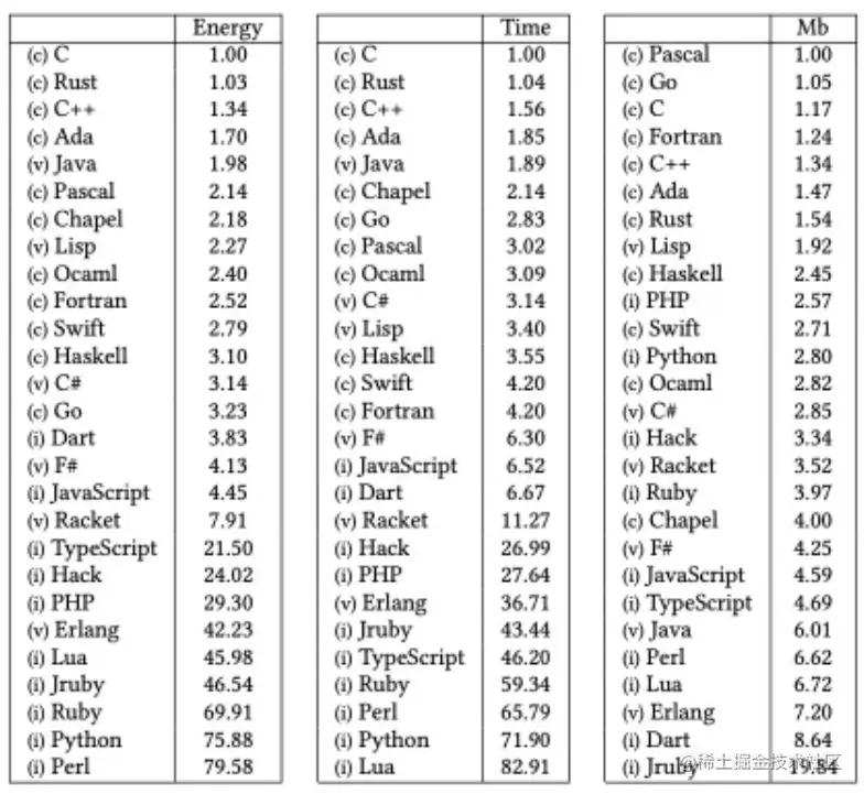 《Energy Efficiency across Programming Languages,How Does Energy, Time, and Memory Relate?》这份报告调研了各大编程语言的执行效率,虽然场景的丰富程度有限,但是也能够让我们见微知著。