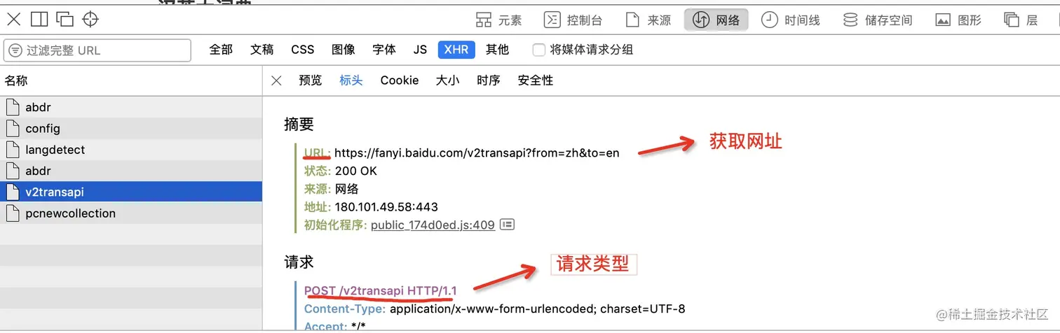 通过页面信息(如下图)可知,百度翻译的请求类型是post类型,并且我们获取到了网页的URL