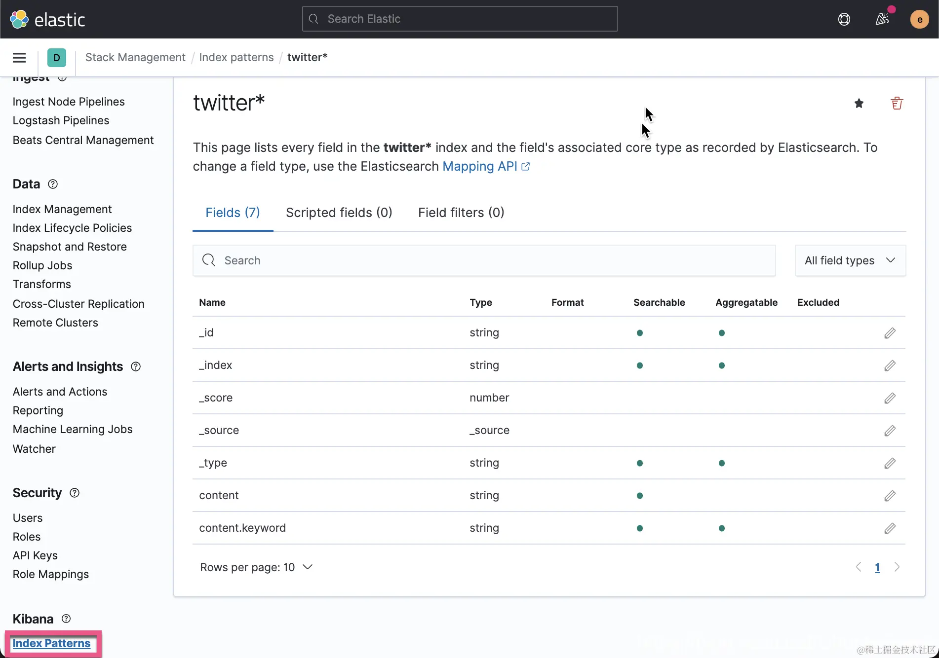 它将生成一个叫做 twitter 的索引。我们接着为它创建一个叫做 twitter* 的索引模式: