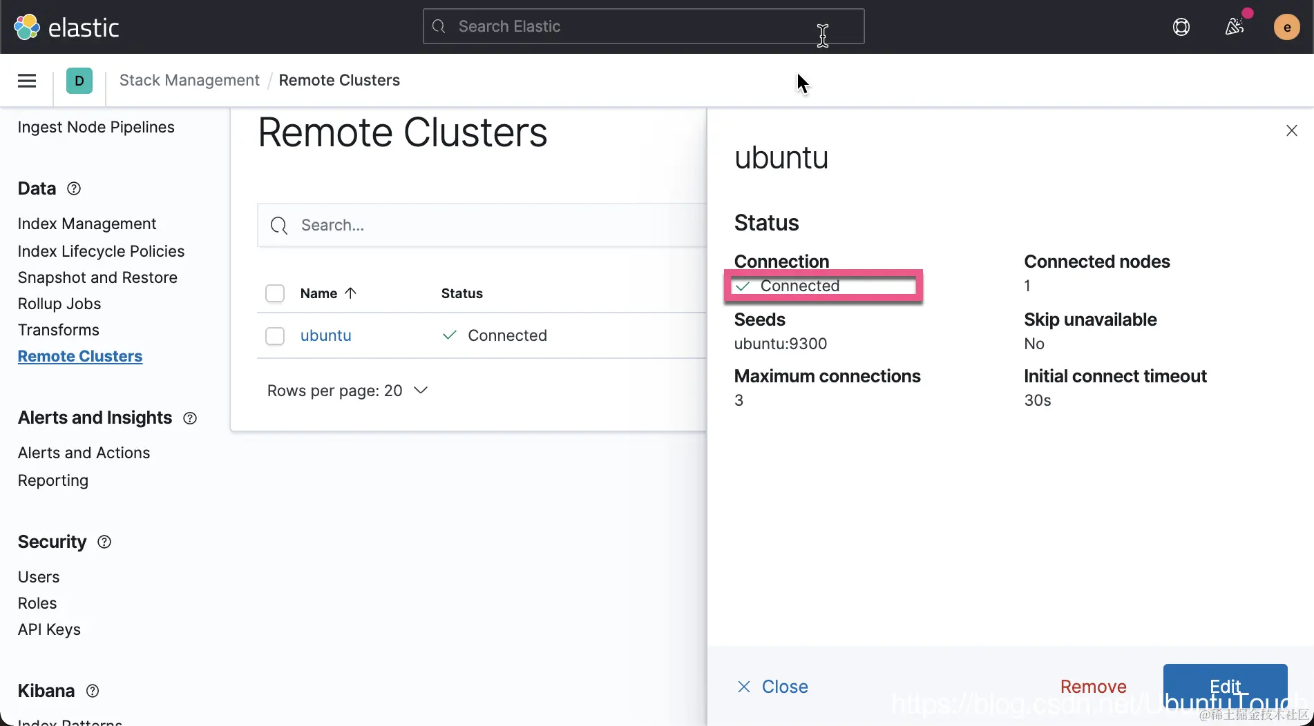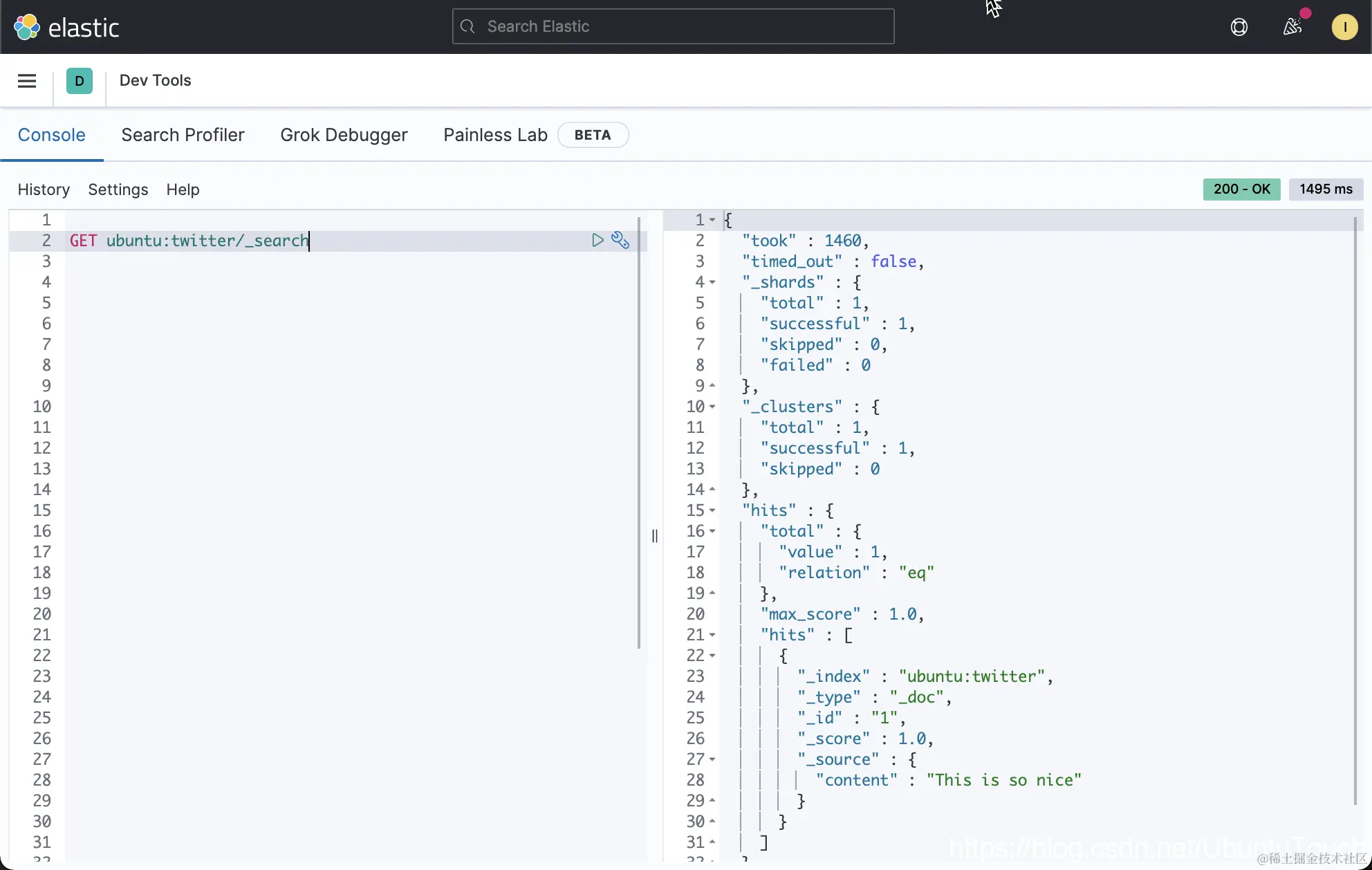 请注意上面命令中的 ubuntu 是我们之前创建的 remote cluster 的连接的名称。从上面的结果中我们可以看到远程的索引 twitter 的搜索结果。
