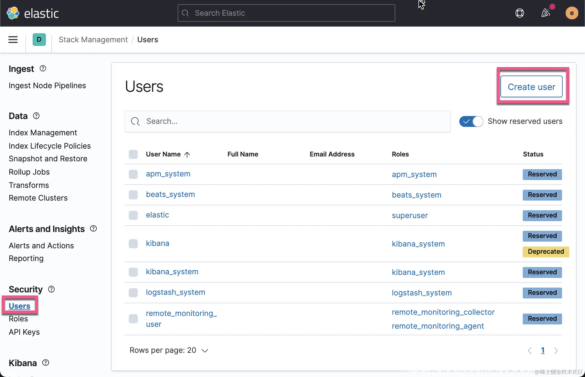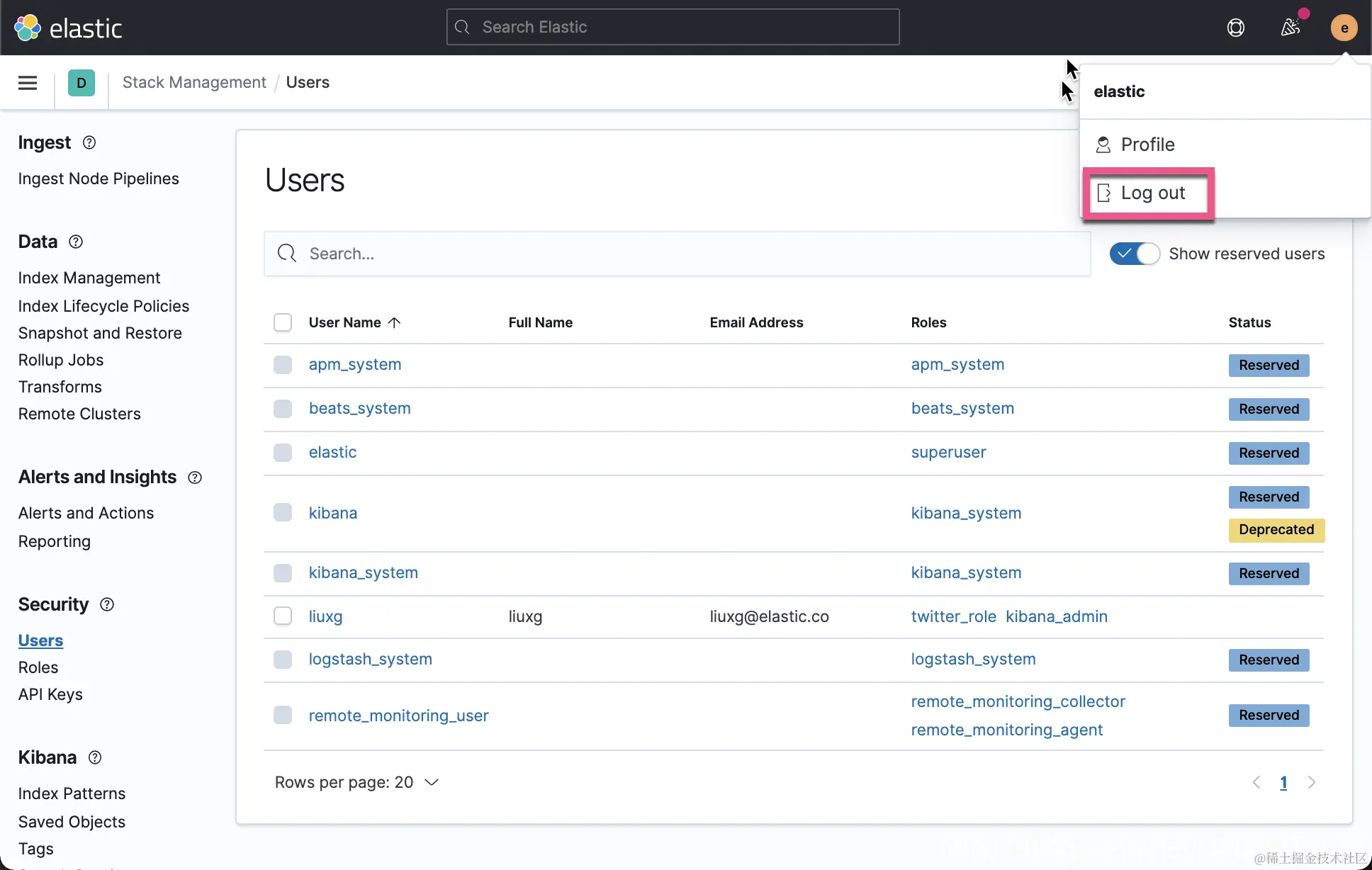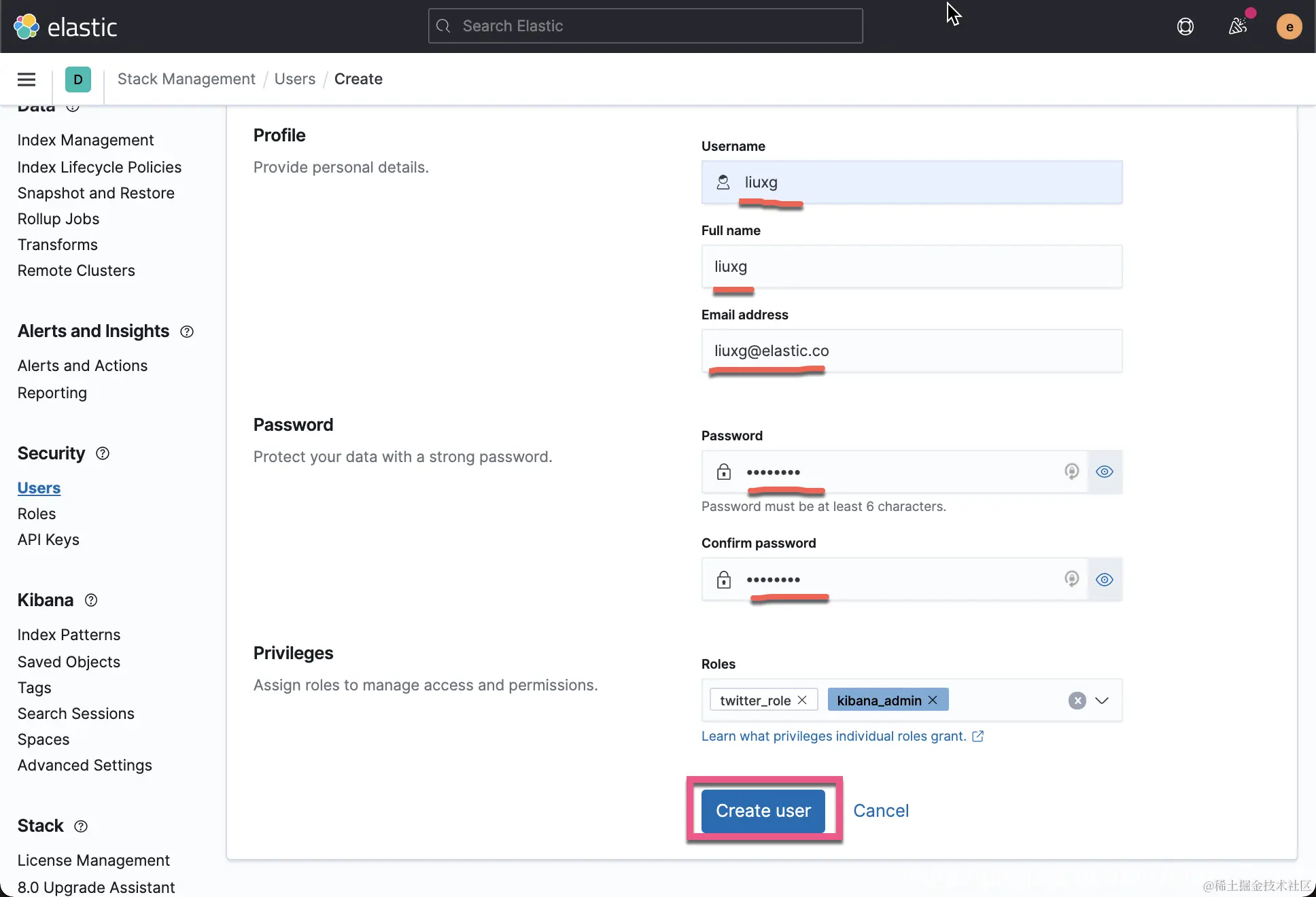 这里的 manage_security 其实不是必须的。我设置它的目的是想在我接下来创建的用户 liuxg 中能进行一些关于 security 的管理。我们可以接下来创建一个叫做 liuxg 的用户,并把 twitter_role 赋予给它: