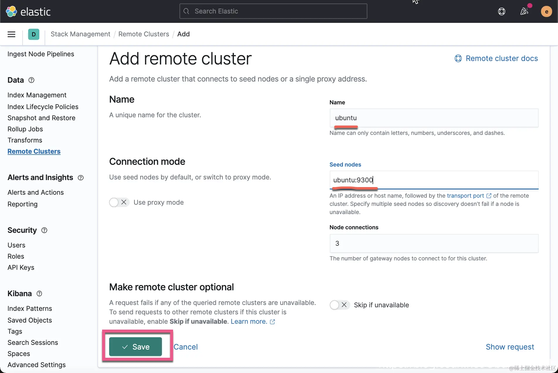 - 从本地群集中将 CA 证书添加为每个远程群集中的受信任 CA(请参阅传输 TLS 设置)。如果你是两个不同证书的集群,你可以在 elasticsearch.yml 中的