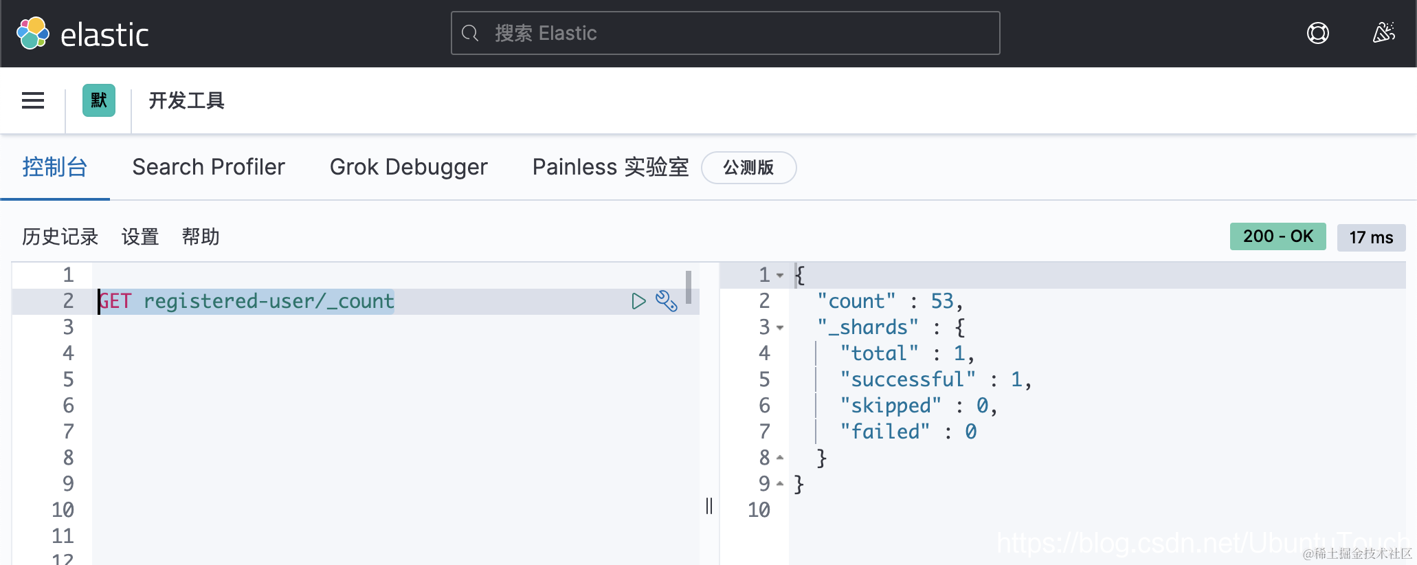 我们现在马上回到 Kibana 的界面使用如下的命令来查看:
