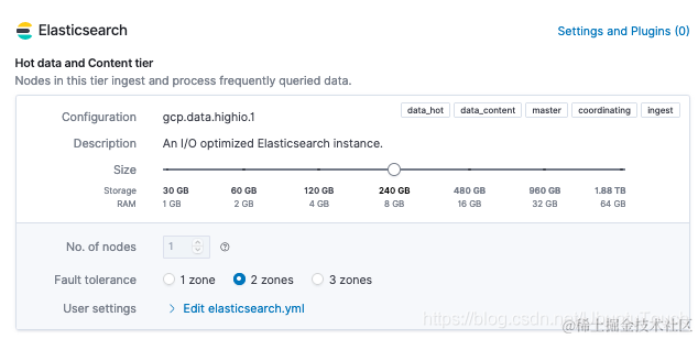 以上面的 Elasticsearch Service 为例,在两个区域中具有 8GB 的物理内存(这将总共分配两个节点)