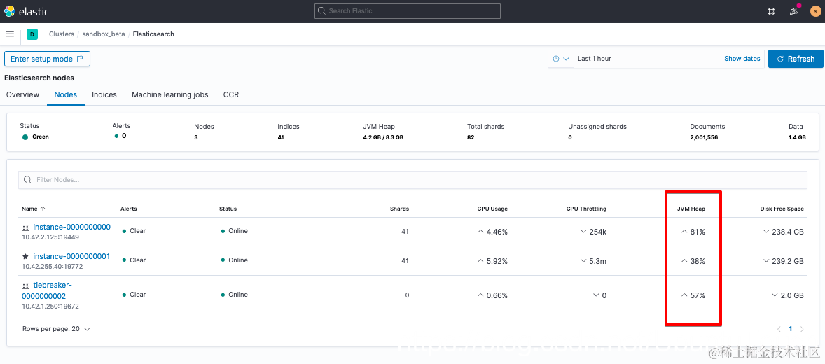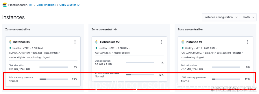 如果这不是你第一次接触熔断器,或者你怀疑这将是一个持续存在的问题(例如,持续击中85%,那么该是时候考虑扩展资源了),那么你需要仔细研究一下 JVM 内存压力作为你的长期堆指标。 你可以在 Elasticsearch Service > Deployment 中进行检查