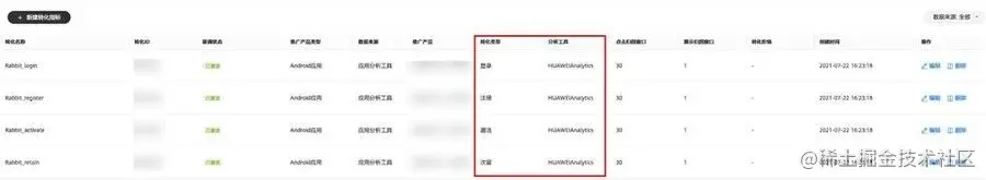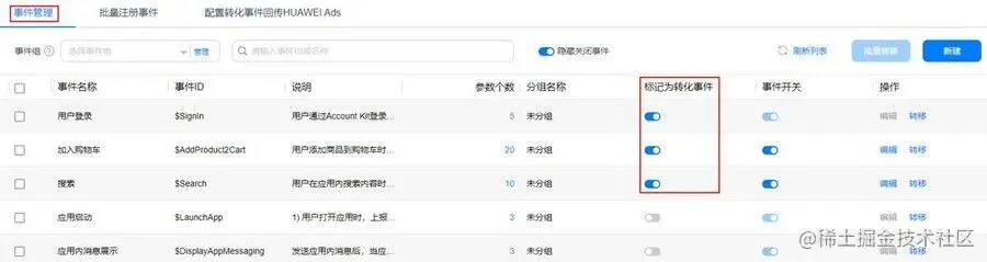 在华为分析控制台的“事件管理”页面中,将需要回传HUAWEI Ads的事件标记为转化事件,比如“用户登录、加入购物车、搜索、应用启动”等。