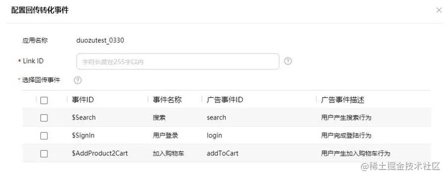 在“配置回传转化事件”页面,填写从 HUAWEI Ads获得的 Link ID,并选择回传事件即可。
