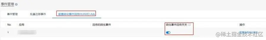 在“配置转化事件回传HUAWEI Ads”页面中,选择需要开启转化事件回传开关的Android应用并开启开关。