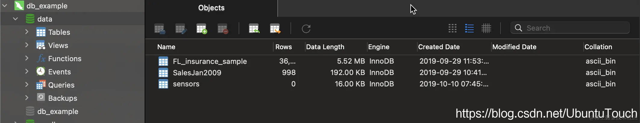 在上面 data 是我们在 MySQL 中的数据库。sensors 以及 SalesJan2009 是 data 数据库中的表格: