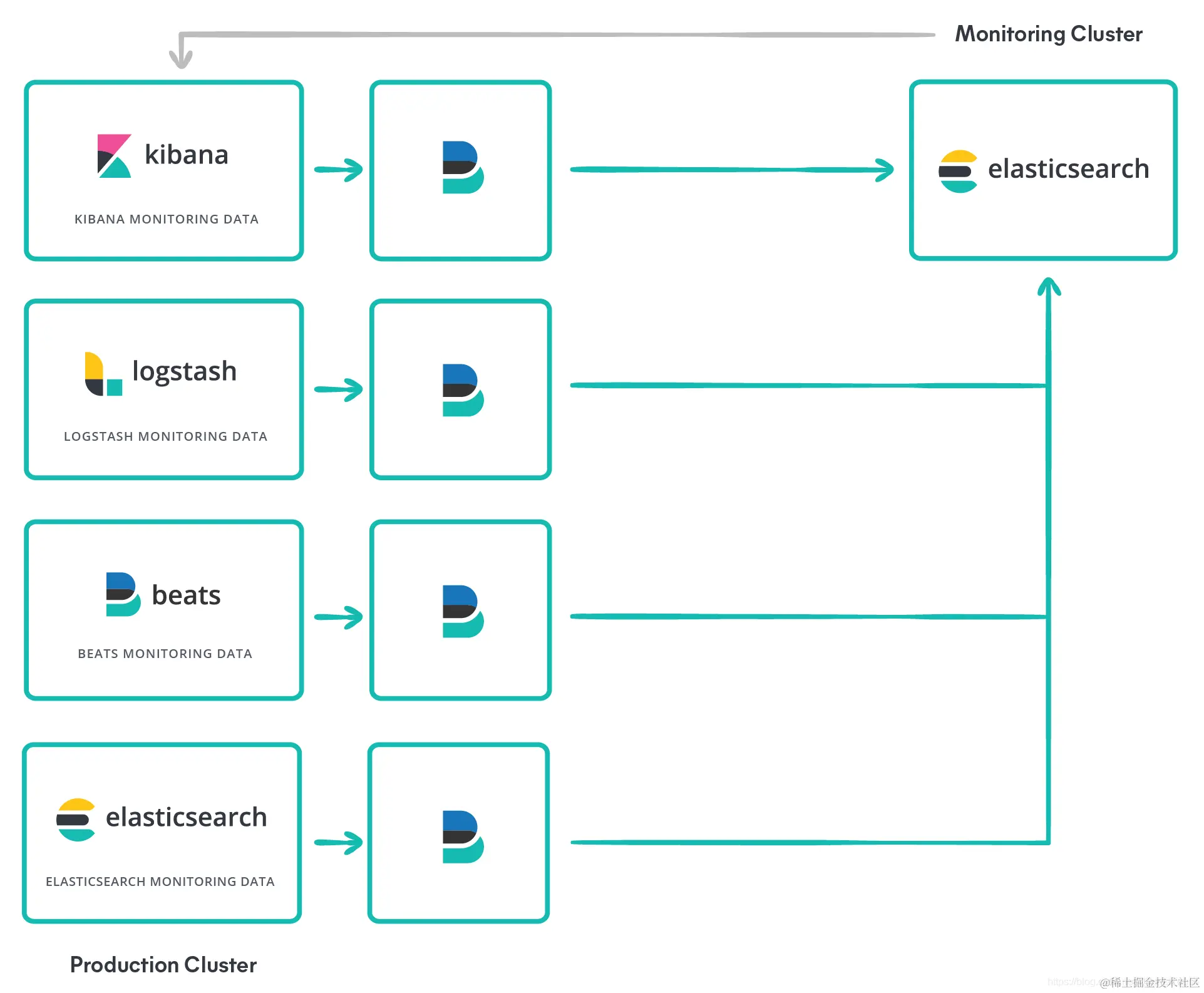 使用这种方法,我们就像之前文章介绍监控 Beats, Elasticsearch 及 Kibana 一样,我们可以直接把数据发送到监控的 Elasticsearch 集群。我们可以使用 Kibana 对数据进行可视化。在这个方式下,我们必须借助 Metricbeat 来对所需要的指标进行采集。