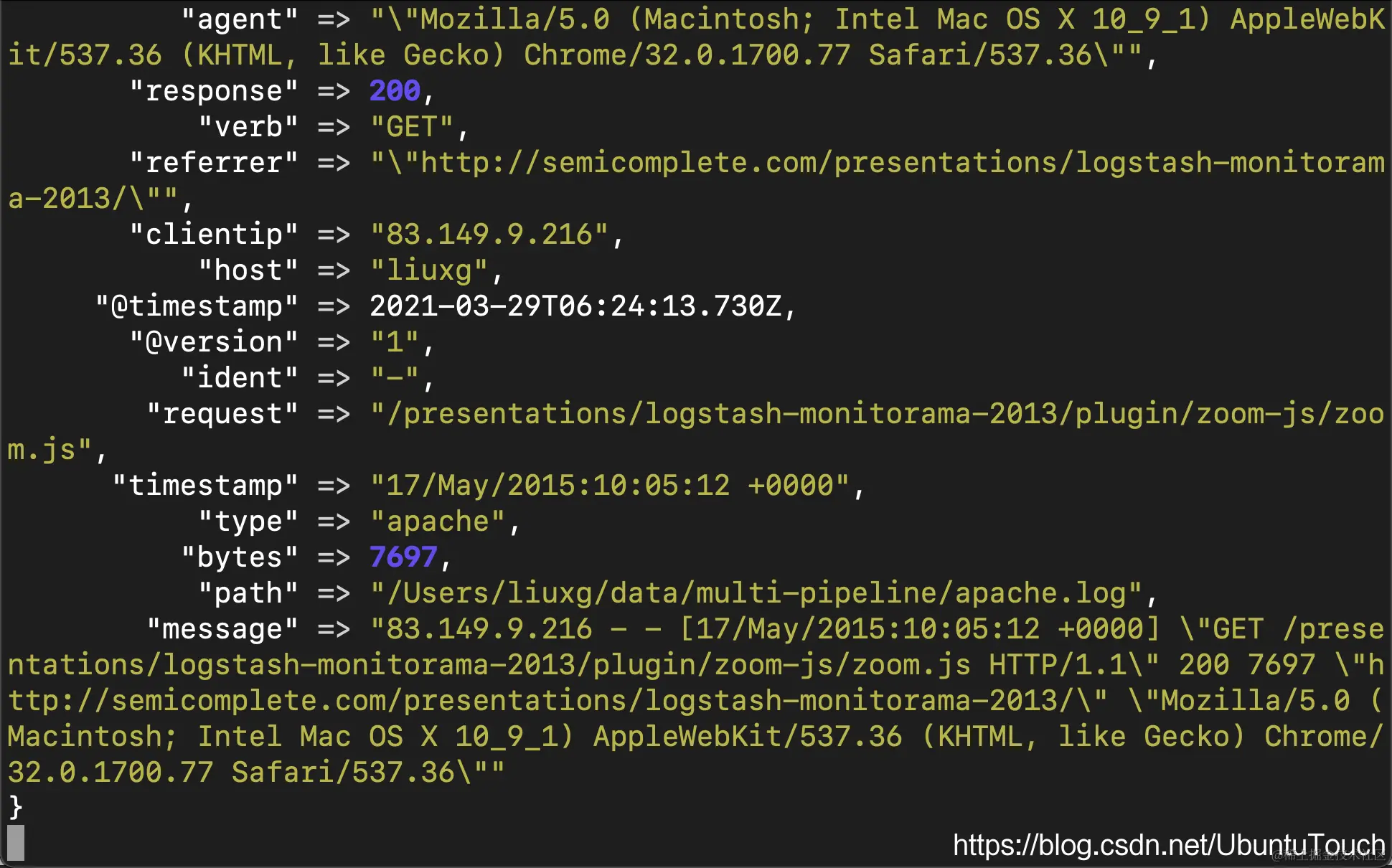 > 84.149.9.216 - - [17/May/2015:10:05:57 +0000] "GET /presentations/logstash-monitorama-2013/css/fonts/Roboto-Bold.ttf HTTP/1.1" 200 38720 "http://semicomplete.com/presentations/logstash-monitorama-2013/" "Mozilla/5.0 (Macintosh; Intel Mac OS X 10_9_1) AppleWebKit/537.36 (KHTML, like Gecko) Chrome/32.0.1700.77 Safari/537.36"